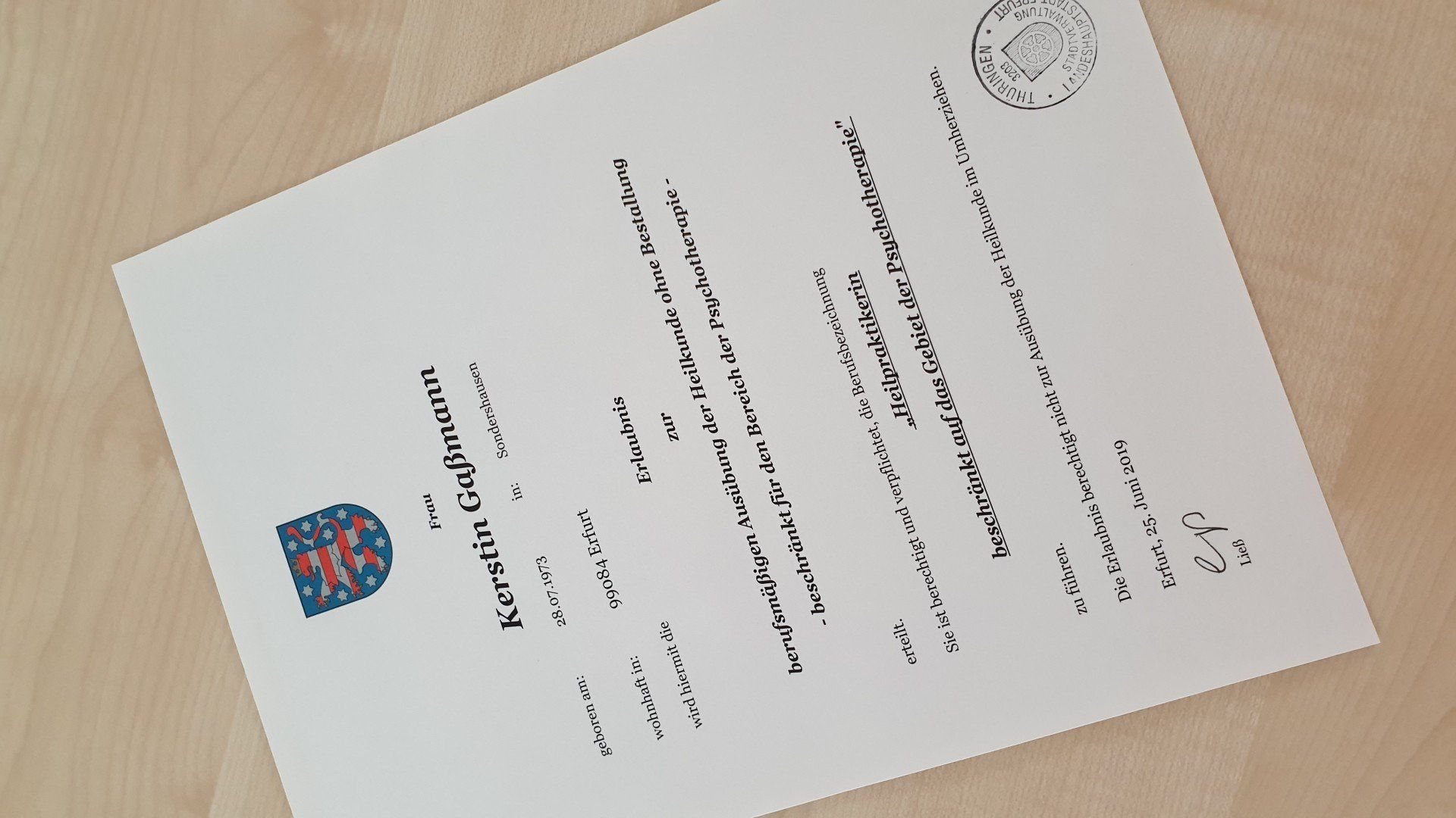 Mit der letzten Prüfung vor dem Gesundheitsamt Erfurt habe ich nun den Abschluss zur Heilpraktikerin beschränkt auf das Gebiet der Psychotherapie. Was ändert sich in der Praxis für Persönlichkeitsentwicklung? Während ich Sie im Coaching in Lebensfragen ohne Krankheitswert unterstütze und begleite (bspw. in Beziehungs- und Konfliktfragen, bei Entscheidungen, bei der Karriere- und Zukunftsgestaltung oder der Stressbearbeitung) stehe ich Ihnen als Heilpraktikerin für Psychotherapie darüber hinaus auch als Therapeutin zur Seite, um durch geeignete Maßnahmen dazu beizutragen, Ihre seelische Gesundheit zu erhalten oder wiederherzustellen und Sie zu befähigen, Ihre Selbstheilungskräfte zu aktivieren. Ich erkenne mit meiner Mitgliedschaft die Berufsordnung des Verbandes Freier Psychotherapeuten, Heilpraktiker für Psychotherapie und Psychologischer Berater e.V. (VFP) an und handele danach. Das ist für mich ein Selbstverständnis. Neben den auf meiner Website beschriebenen Coaching-Methoden werde ich ab sofort folgende Therapie-Methoden anbieten: Systemische Therapie Klientenfokussierte Gesprächsführung nach Carl Rogers Hypnose-Therapie Entspannungsmethoden (Progressive Muskelrelaxation nach Jacobson) Nehmen Sie Kontakt zu mir auf! Ich begleite Sie gern auf Ihrem Weg zu seelischer Gesundheit und persönlicher Zufriedenheit. Herzlichst, Ihre Kerstin Gaßmann